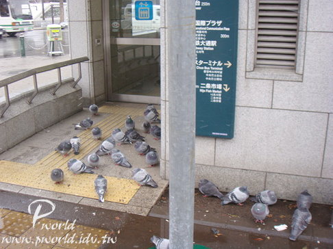 當我們走到電視塔的時候看到許多鴿子瑟縮在地下道出口處