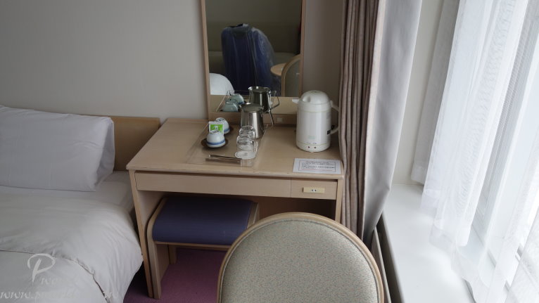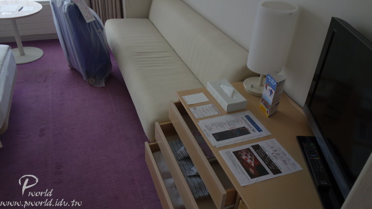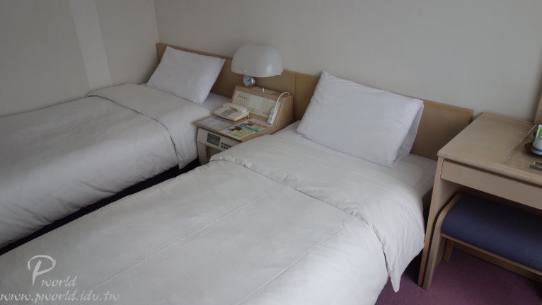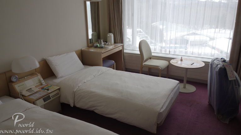 右手邊有滑雪用具置物櫃還有販賣部 販賣部除了零食、飲料、土產 還有在賣有名的盛岡南部鐵器 真的是鐵器 非常有重量 再走過去還有出租滑雪用具的區域 旁邊也是溫泉浴場的入口 再走出去就是滑雪場了 標準的房間 雙人床 化妝桌 還有一張很長的沙發(通常都可以變成床鋪)
