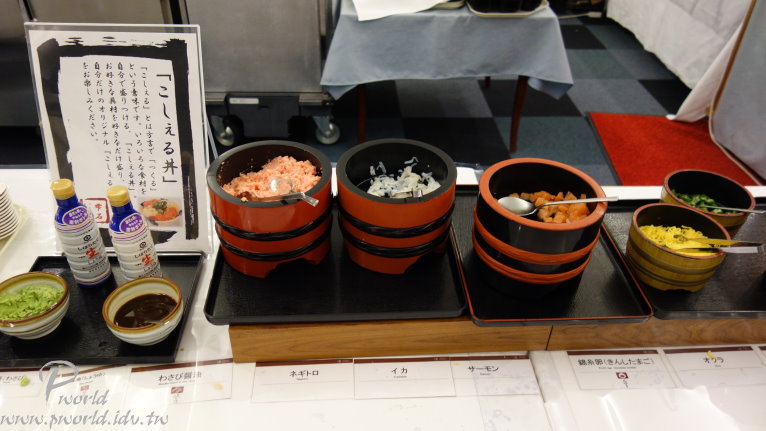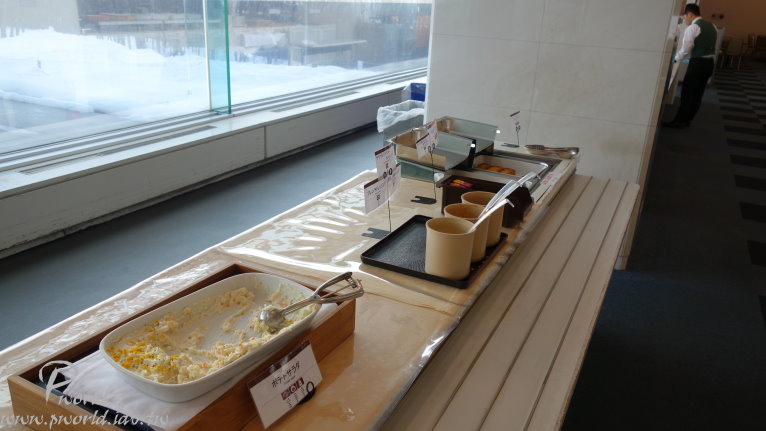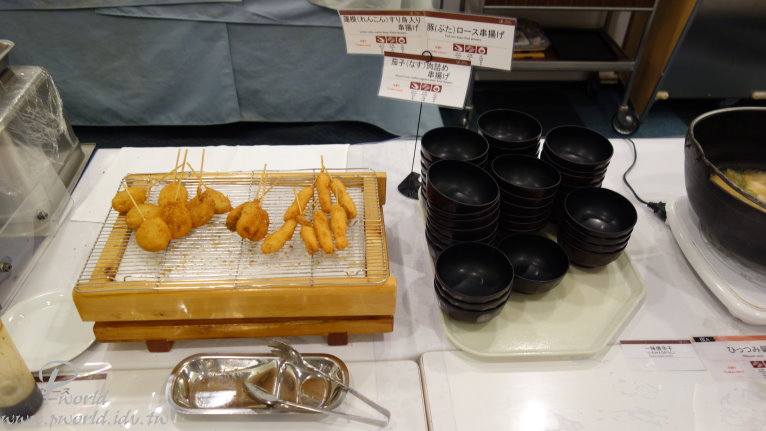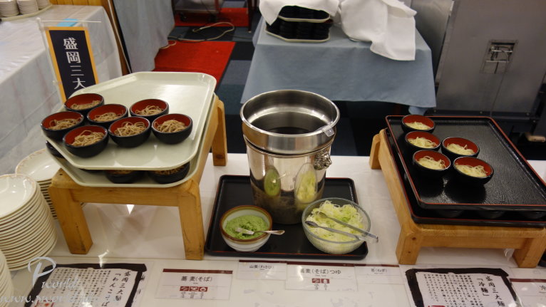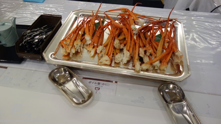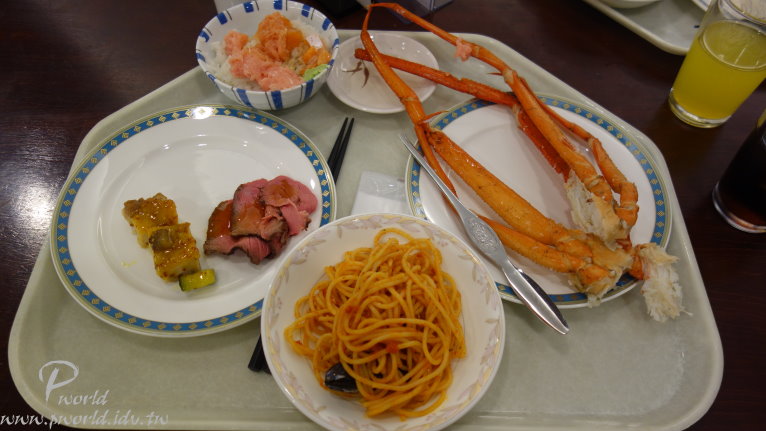 可能是場地大 每一盤菜都分散得比較遠 所以反而還覺得沒有像盛岡住的 HOTEL JIN 來的豐富 晚餐一樣也是自助餐吃到飽 菜色也都差不多 距離盛岡市很近 所以盛岡有名的三大麵這裡也有準備 冬天的螃蟹腳在這裡也是有 另外也可以自製海鮮丼飯 特別的是連大阪的炸串也有 算是滿多樣化的選擇