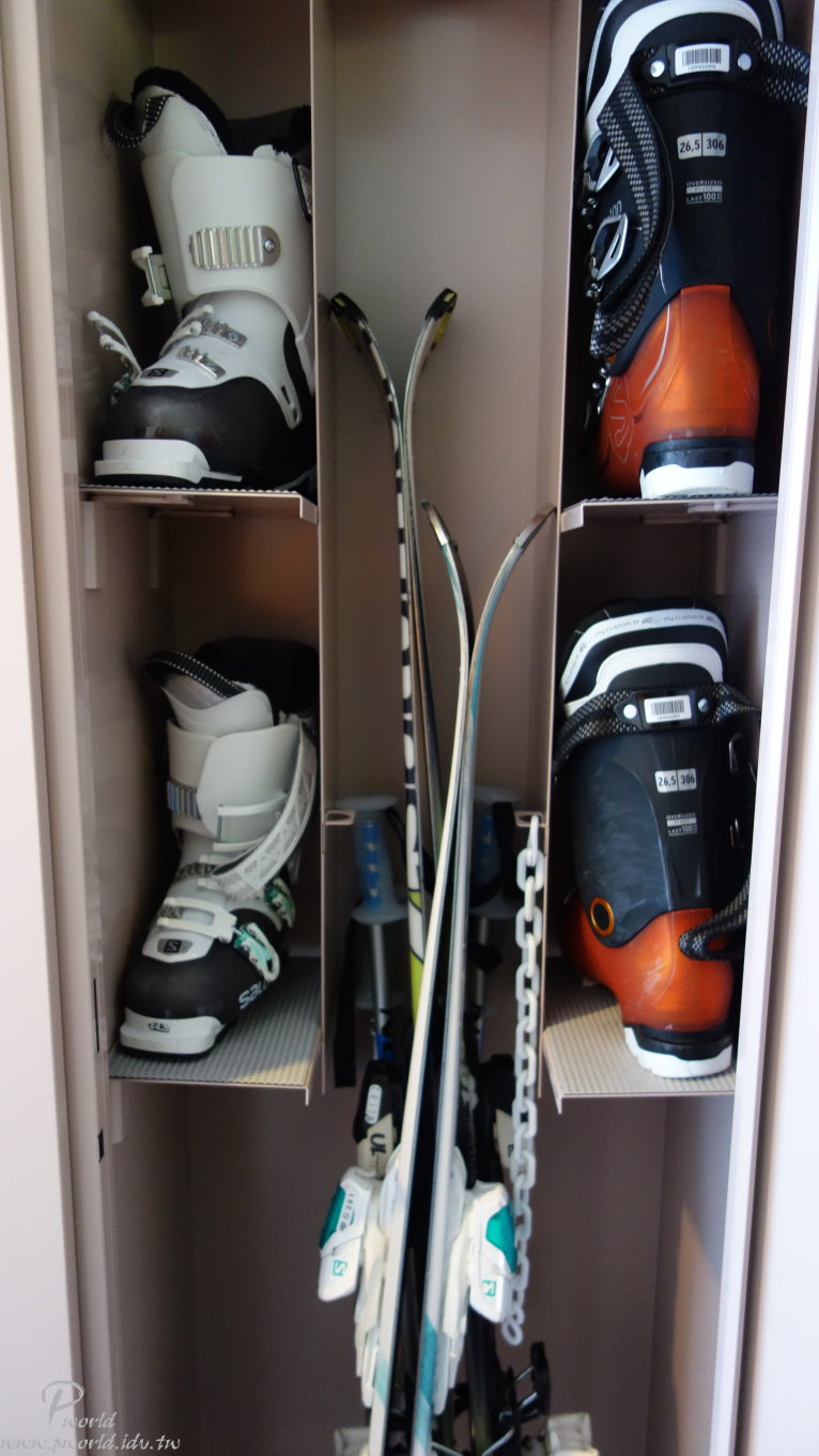 窗外雖然是停車場 但是附近也沒有什麼建築物 所以還能看到遠方的景物 一樓大廳旁有滑雪用具的置物櫃 依照房間編號 每一間房間都有一格 用號碼鎖來開關門片 這樣也不用擔心鑰匙會不見