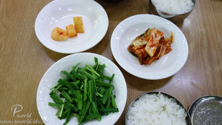 送上來的小菜有泡菜、蘿蔔塊、韭菜