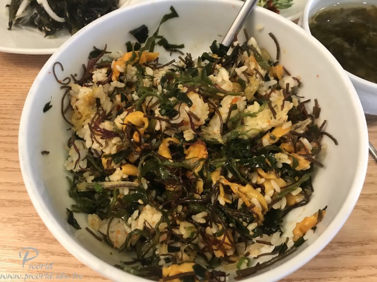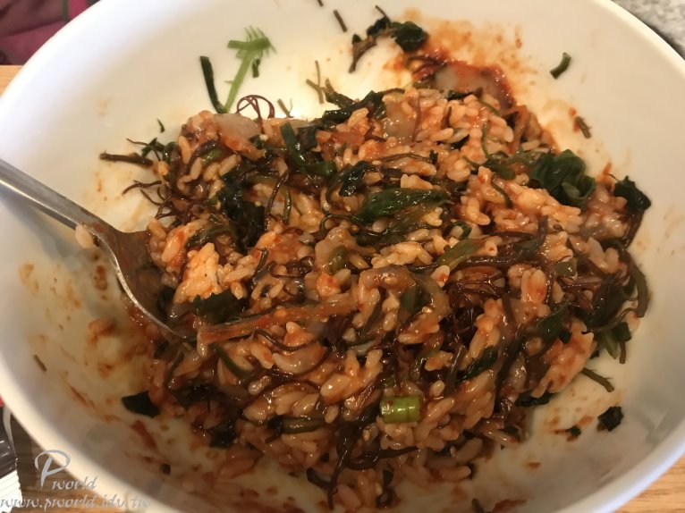 攪拌完就變成這樣 阿 看起來不是很美觀 不過好吃就好 應該是海鞘拌飯(我的蛤蜊拌飯啊) 口感就沒有很好 吃到的口感比較像海帶拌飯 不是我的菜
