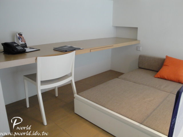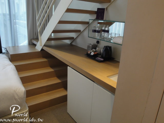 床鋪前就是通往樓上的樓梯 利用樓梯下的空間作洗手台兼小吧台 下面的櫃子裡有一座小冰箱及保險箱 另外吹風機也是放在裡面