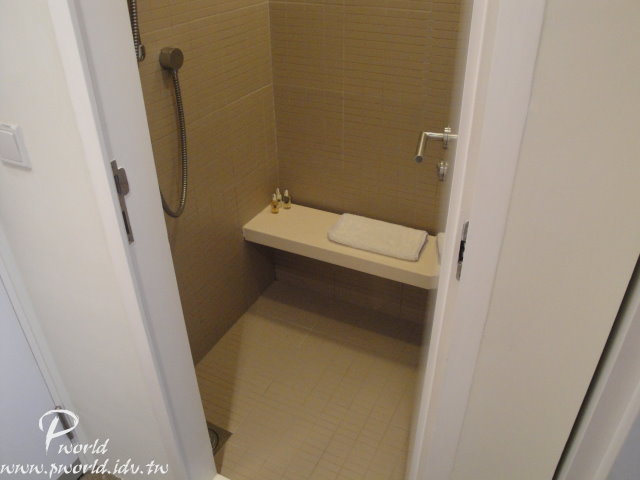 左邊是一間淋浴間 沒有浴缸(當然啦!還奢望有啊!) 因為是淋浴間所以要換穿衣服就要在玄關比較方便 喔!原來玄關拉門的用意就在這裡