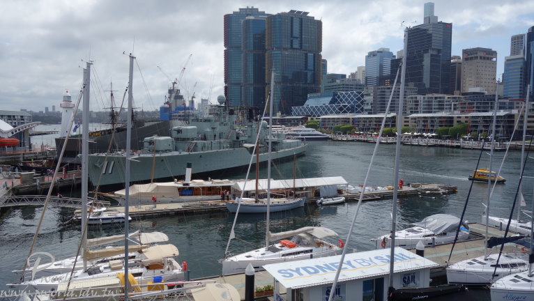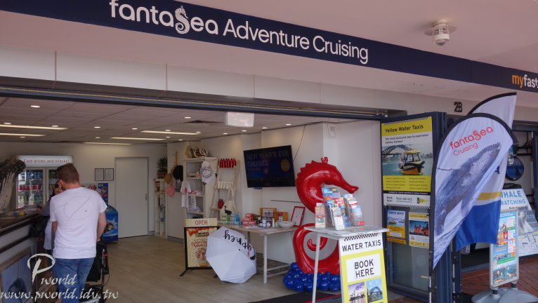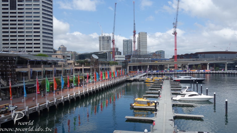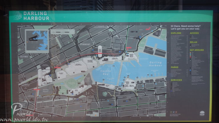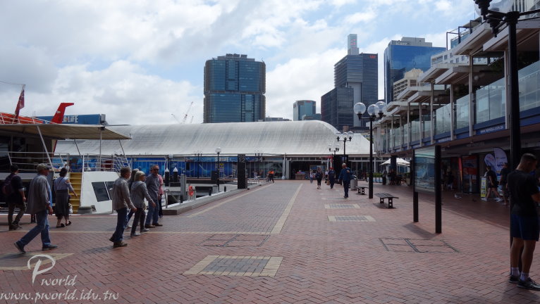橋樑這一頭旁邊是海事博物館 沿途除了可以欣賞達利港四周的建築物外 還可以看到很多渡輪碼頭(當然還有遊艇) 另一頭就是今天的重點行程了 從Pyrmont Bridge橋上搭乘手扶梯下來 這裡就是達利港區域了 港灣邊有許多店家 有營運賞鯨船行程、觀光船行程、商店等 如果想搭乘賞鯨船可以來這裡選擇合適的行程 在達利港這邊有三個特殊景點