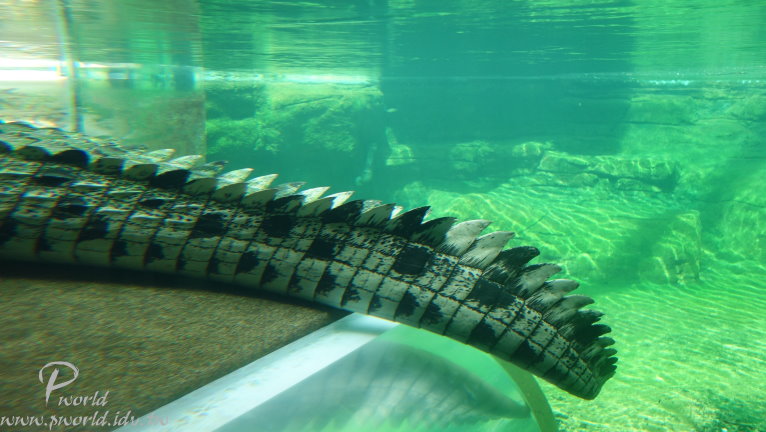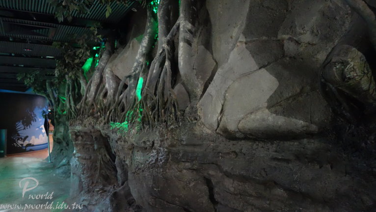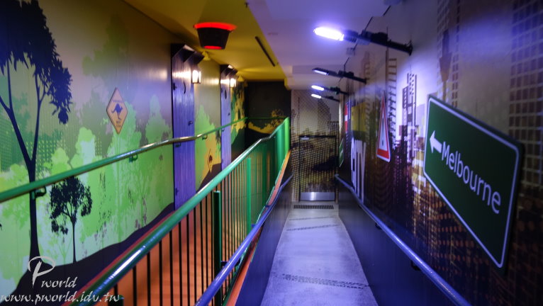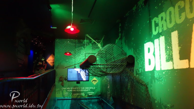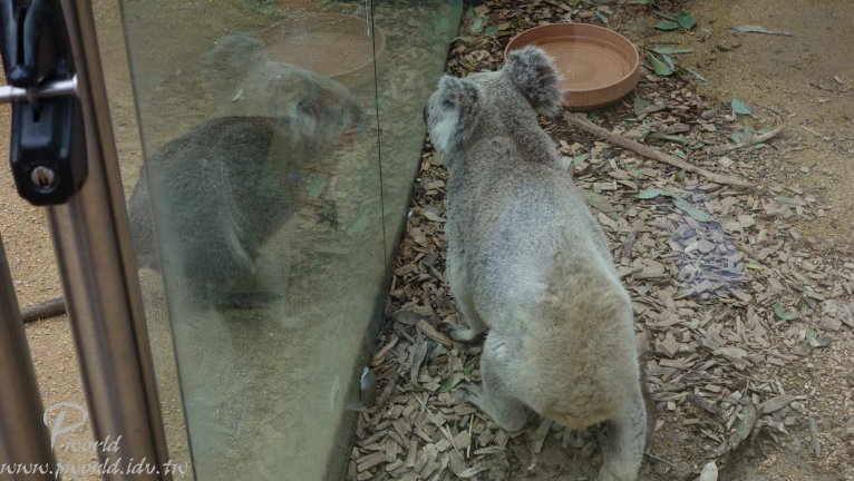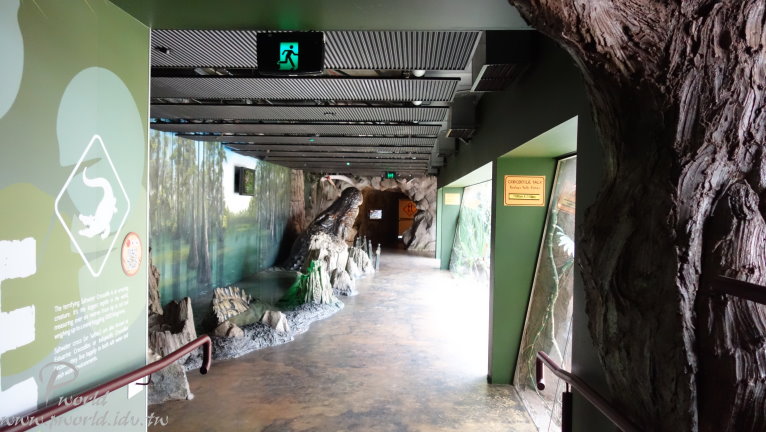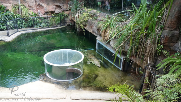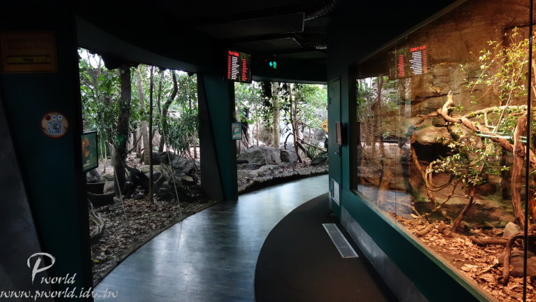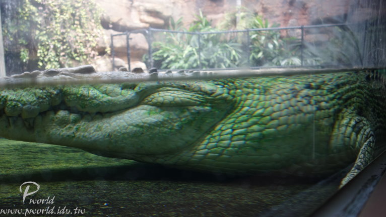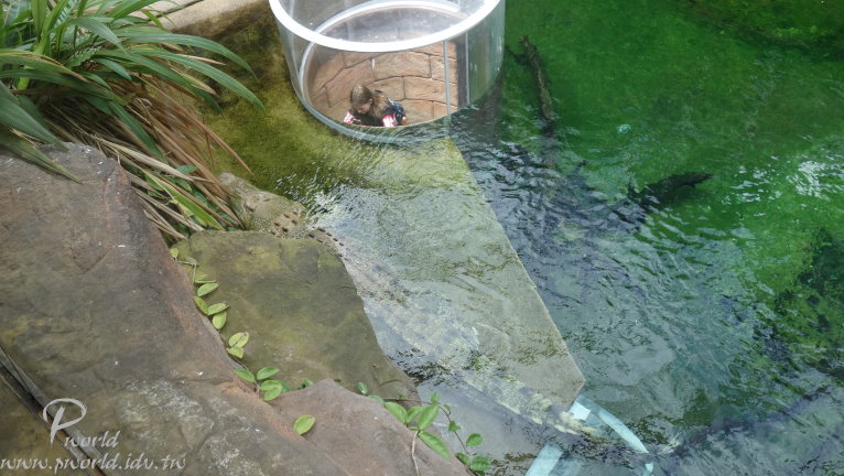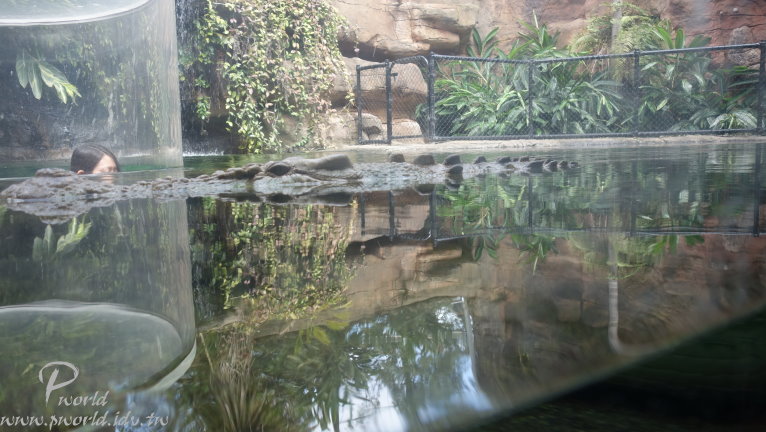 走到後面就會有員工介紹當時段的小動物給遊客認識 不能碰也不能餵食 只能近看 一些準備中的動物也在一旁待命 每一段的時間很短(15分鐘) 還沒輪到自己上場時 動物就在自己的區域內休息 讓我們有機會很近的距離看到無尾熊(當然還是不能碰) 動物園裡還有一個特別的區域 鱷魚沼澤區 遠遠就可以看到一隻大鱷魚待在水池中 而且還特別設計一個觀景窗 讓你可以就近觀賞 場景的設計很成功 當你一步一步前往水池邊時 會看到相關捕捉鱷魚的器具 而且四周環境也漸漸變成在沼澤底下 有用心 可以這麼近距離看到鱷魚(當然有隔著玻璃) 好大一隻