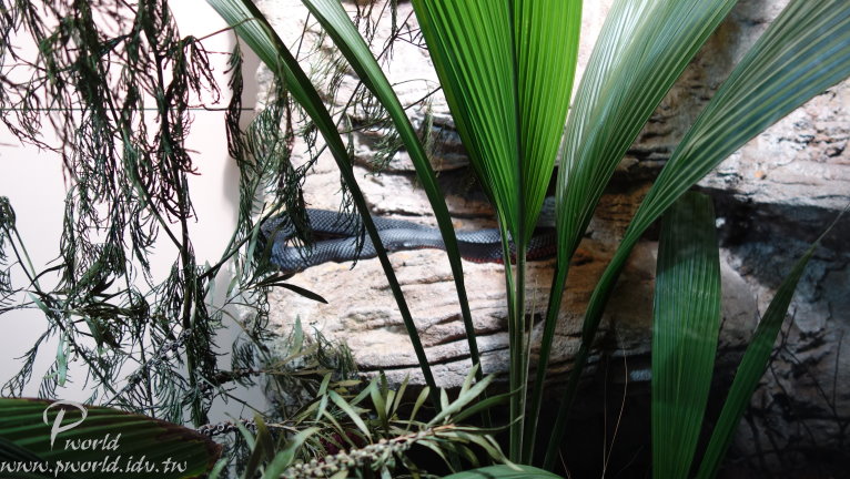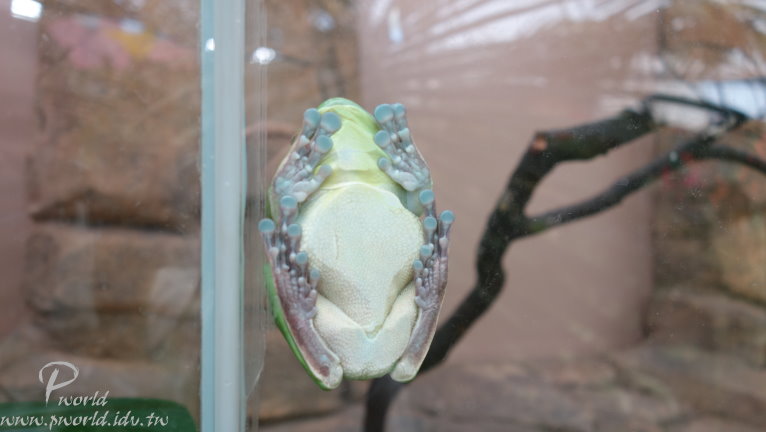 使用上非常方便 只要在每一個景點入口直接出示手機內的憑證就可以 連去櫃台換票卷都不用 一開始看到的都是以兩棲爬蟲類為主 還那麼巧 剛好有一隻青蛙停在玻璃上 可以清清楚楚看到青蛙的腹部和牠的腳底是怎麼吸在玻璃上的 在覺得很可愛時 沒料到的是 在過去一些竟然就是蛇類